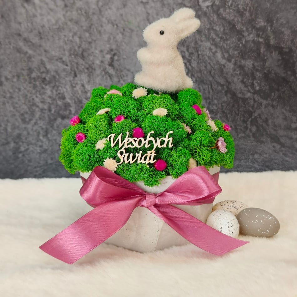 Ręcznie wykonana betoniczka z mchem i napisem „Wesołych świąt” – prezent na Wielkanoc.