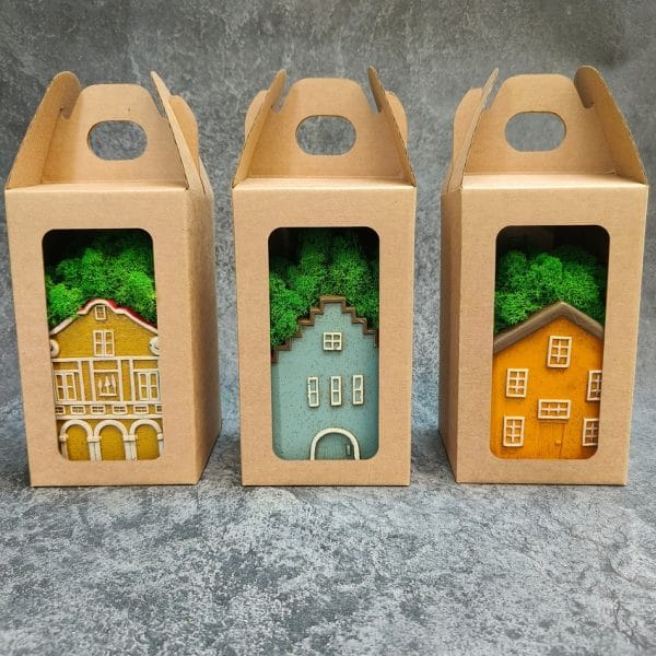 Elegancki domek z mchu reniferowego zamknięty w pudełku z okienkiem i rączką. Gotowy do wręczenia – bez dodatkowego pakowania.