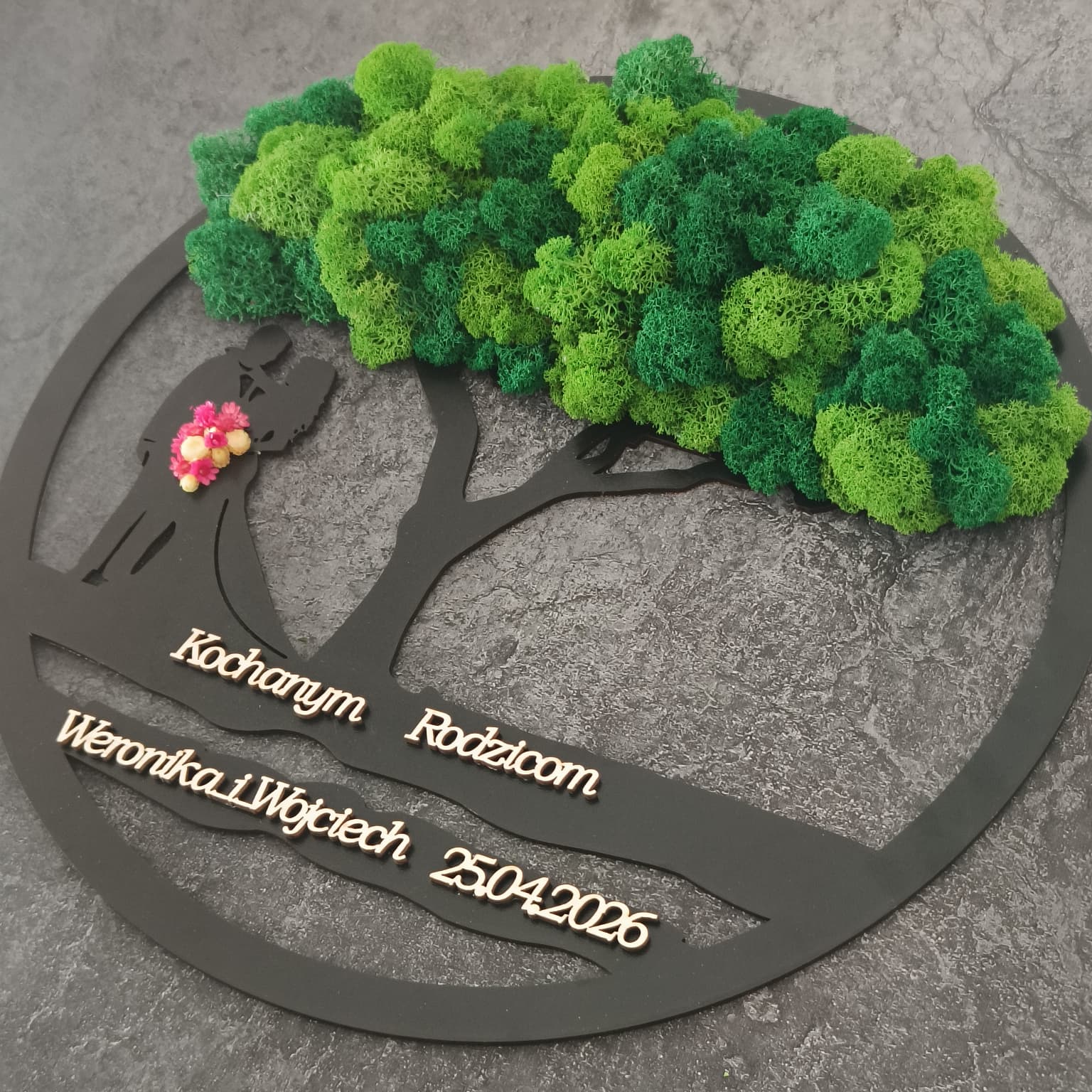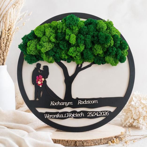 🌿 Obraz „Podziękowanie dla Rodziców / Dziadków – Para pod Drzewem” z mchem i bukietem 💚💍