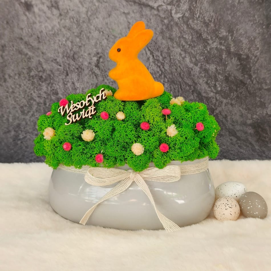 Szara doniczka owalna z mchem, kwiatkami i zajączkiem – prezent na Wielkanoc