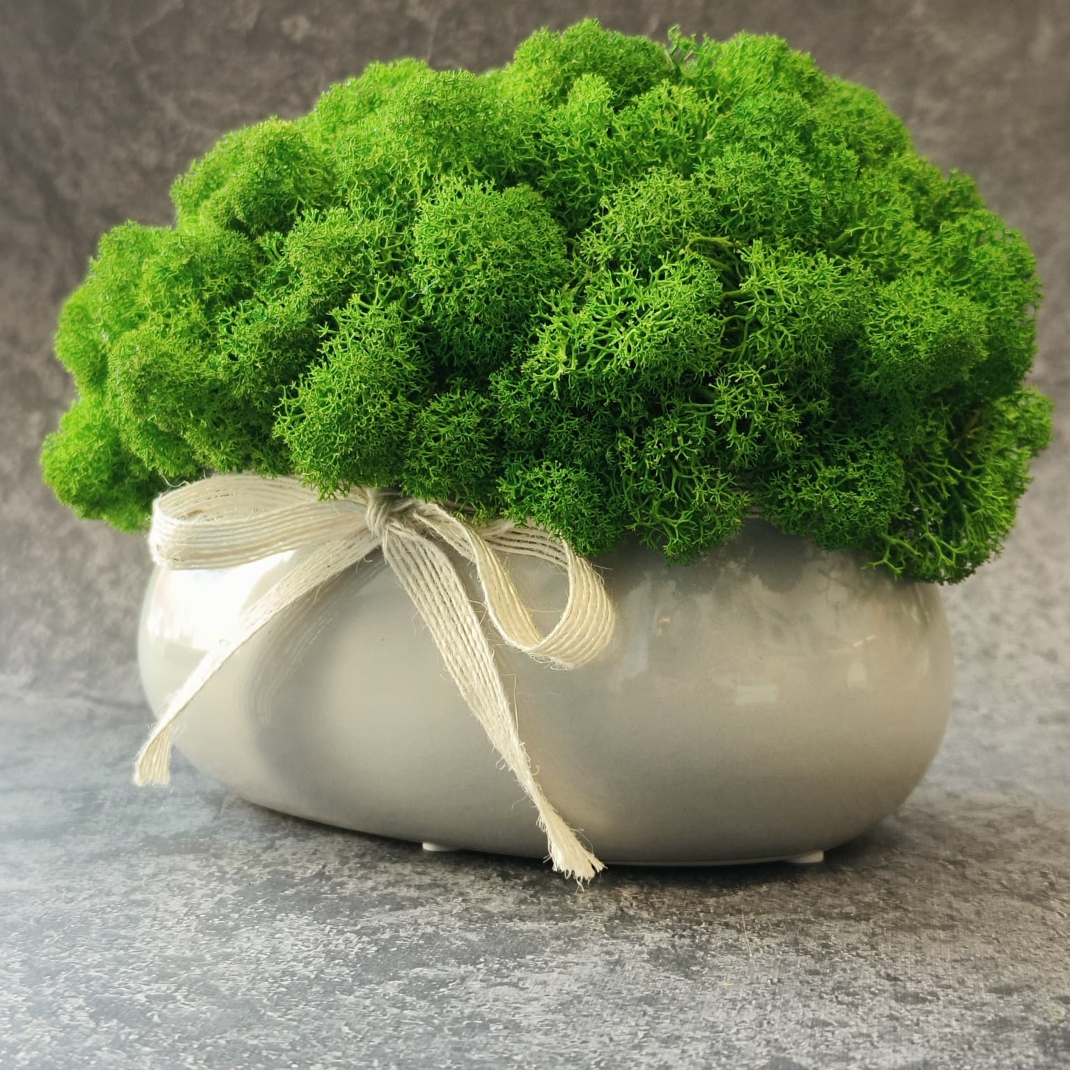 🌿 Owalna Doniczka z Kokardką i Chrobotkiem Reniferowym – Elegancka Dekoracja na Każdą Okazję